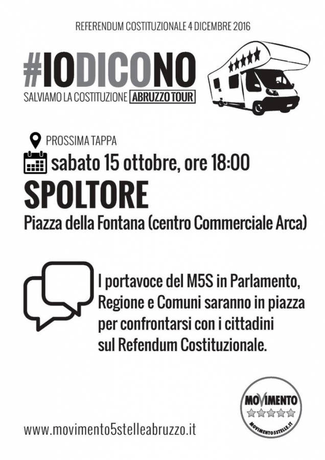 Il Movimento 5 Stelle di Spoltore comunica che in data 15 ottobre 2016 alle ore 18.00, presso la piazza della fontana del Centro Commerciale L'Arca, farà tappa il camper del tour Abruzzese #IODICONO, in vista del referendum costituzionale del prossimo 4 Dicembre.