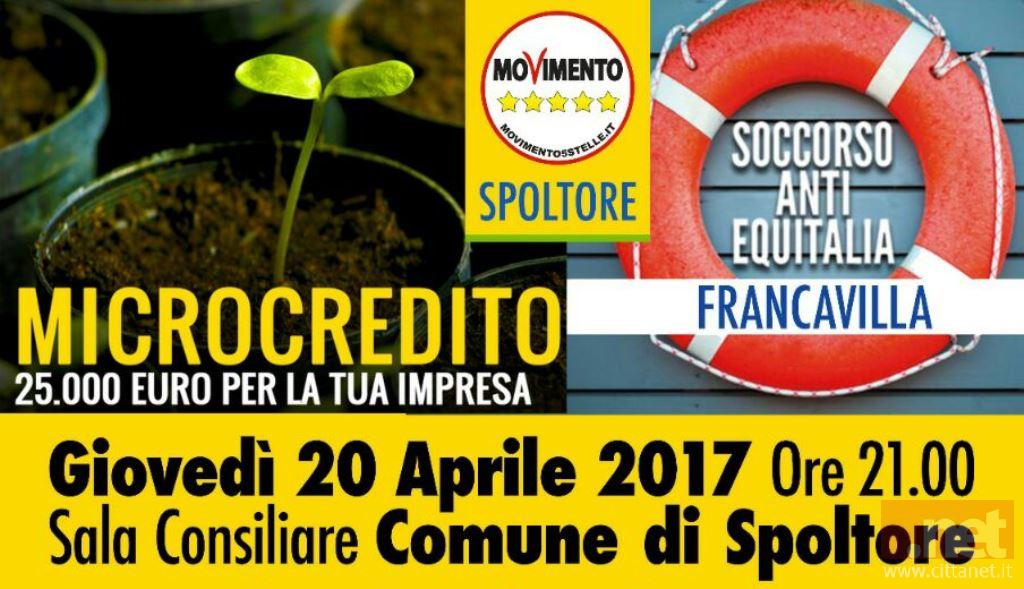 Saranno il Microcredito ed il Punto di Ascolto SoS Anti Equitalia Abruzzo gli argomenti al centro del dibattito pubblico M5S dalla parte del cittadino, che si terrà domani sera a Spoltore nella sala consiliare del Comune alle ore 21. Ad intervenire il consigliere Comunale Giorgia Cipriani ed il consigliere Regionale Domenico Pettinari, parteciperanno anche il Consigliere comunale di Francavilla Livio Sarchese e il commercialista Gennaro Donadio . “L'evento” spiegano gli organizzatori di Spoltore “nasce per offrire una risposta concreta alle problematiche che ci sono state riportate dai cittadini. Un disagio importante quello economico, avvertito soprattutto dalle attività commerciali ed in particolare da quelle del centro storico. Grazie al punto SoS Equitalia abruzzese ed al Microcredito il M5S è in grado di dare un sostegno concreto alle persone in difficoltà e domani sera spiegheremo in che modo”.