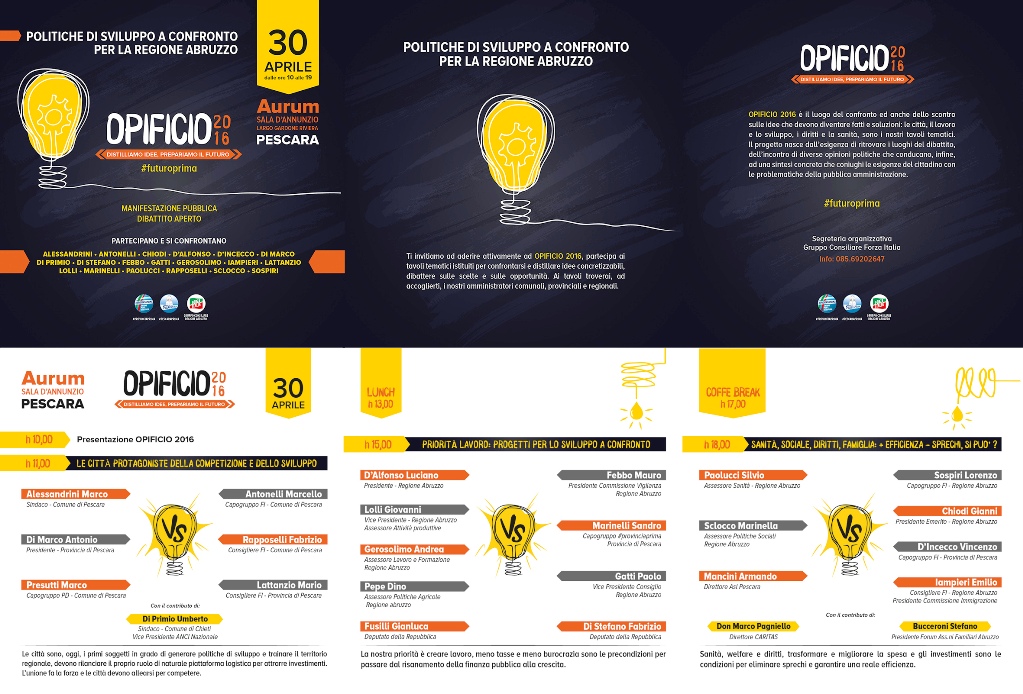 Il progetto nasce dall’esigenza di ritrovare i luoghi del dibattito, dell’incontro di diverse opinioni politiche che conducano, infine, a una sintesi concreta che coniughi le esigenze del cittadino con le problematiche della pubblica amministrazione. E’ questo l’obiettivo di “Opificio 2016, distilliamo idee, prepariamo il futuro”, la manifestazione in programma sabato 30 aprile a partire dalle ore 10:00 presso la sala D’Annunzio dell’Aurum a Pescara, organizzata dal Gruppo consiliare regionale di Forza Italia con #Provinciaprima e #Pescaraprima.