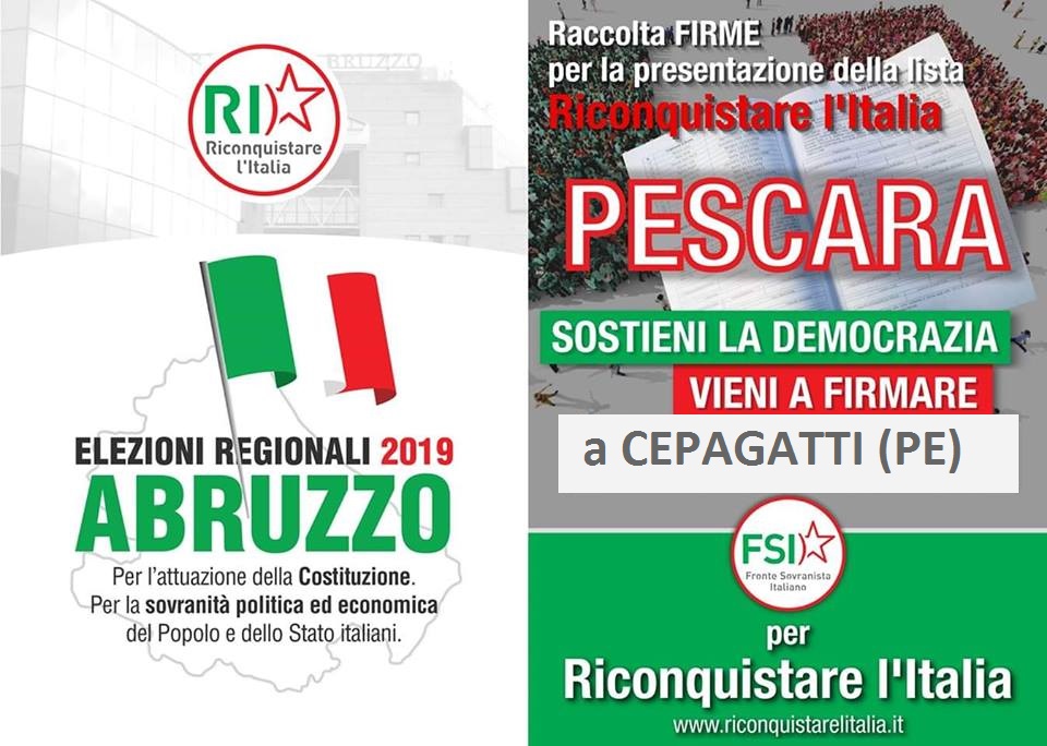 Riconquistare l'Italia, nuovo progetto politico promosso dal FSI - Fronte Sovranista Italiano, sta nuovamente lavorando in vista delle prossime elezioni regionali in Abruzzo che si terranno in data 10 febbraio 2019. La sua presenza vuole proprio rafforzarsi in questa regione, poiché in essa vive un nutrito gruppo di militanti del partito Sovranista. Questa sarà la seconda competizione elettorale in Abruzzo con il nome "Riconquistare l'Italia", come ormai noto, la prima è stata la candidatura alle elezioni comunali di Cepagatti tenutesi il 10 giugno scorso. Prima ancora di queste, il progetto era stato già presentato alle elezioni comunali di Avezzano nel 2017.