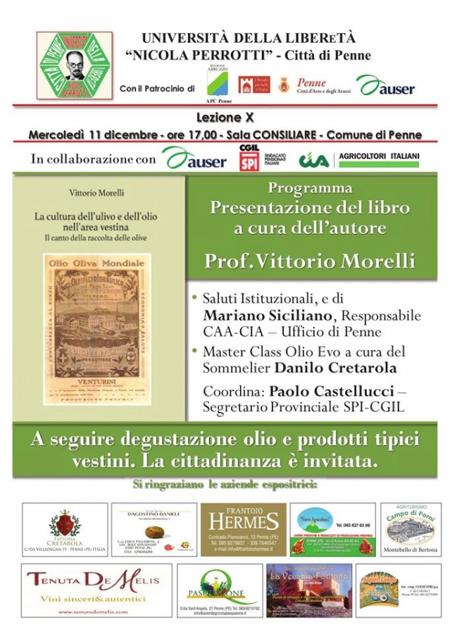 L'Università della LIBEReTÀ "Nicola Perrotti – Città di Penne" organizza per mercoledì 11 dicembre alle ore 17.00 nella Sala Consiliare del Comune di Penne, un convegno sull'olio d'oliva prodotto nell'area vestina; parteciperanno oltre alle autorità istituzionali, Mariano Siciliano, responsabile CAA-CIA di Penne, il sommelier dell'olio Danilo Cretarola, Paolo Castellucci Segretario SPI-CGIL provinciale.