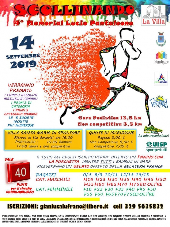 Oggi torna l'ormai tradizionale appuntamento con Scollinando a Villa Santa Maria di Spoltore, il memorial Lucio Pantaleone dedicato agli amanti della corsa e giunto alla quarta edizione. La gara, valevole per il Circuito CorriAbruzzo è organizzata dall’associazione La Villa con il patrocinio dal Comune di Spoltore. Il percorso è lungo complessivamente 13,5 km: sono previste inoltre una corsa "non competitiva" di 3,5 km pensata per coinvolgere tutti in questa giornata e una gara a parte riservata ai bambini.