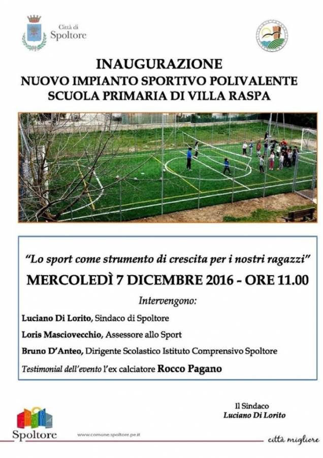 Inaugurazione del nuovo impianto sportivo polivalente di Villa Raspa, in programma mercoledì 7 dicembre 2016